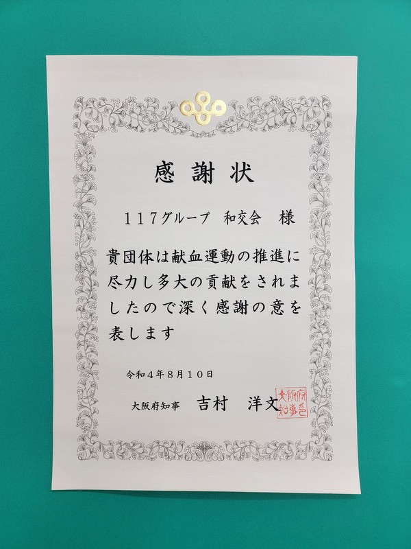 この感謝状は、献血運動の推進に特に積極的、他の模範となる実績を示した団体に贈呈されています。