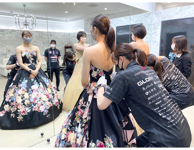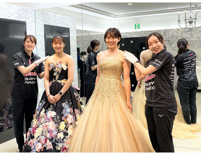 ヴィクトリーナ姫路の選手4名様が、ラヴィーナ姫路に職業体験の為お越しになりました。 選手の皆様には、コスチュームアドバイザーの業務として、ドレス選びのご案内やフィッティングなどを体験、ご自身もドレスをご試着いただきました。 ドレスをご覧になった瞬間、「かわいい」「きれい」と歓声があがり、実際にドレスを着るとさらに笑顔が輝き、とてもよくお似合いでした。 短い時間でしたが貴重な体験をしていただけました。