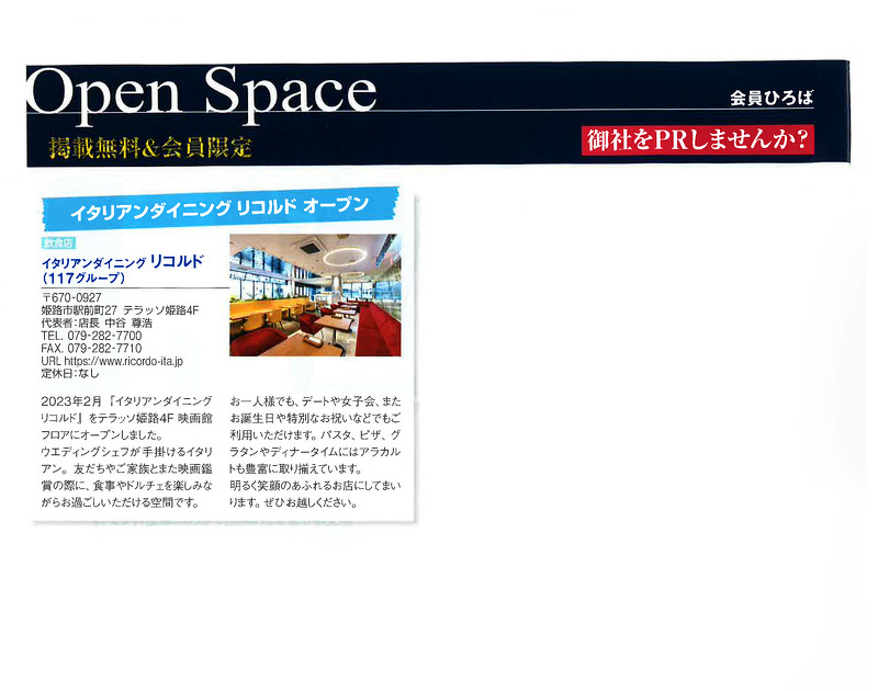 イタリアンダイニング リコルドがひめじ商工会議所報