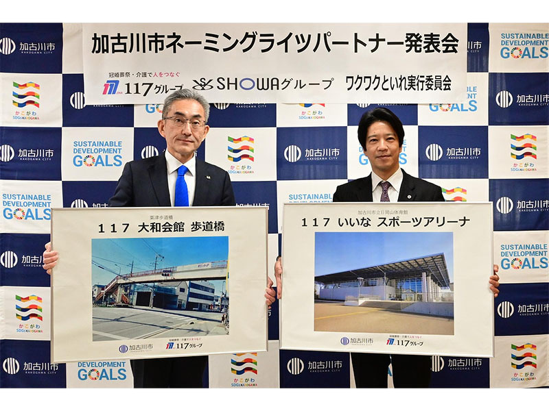 加古川市で初めてのネーミングライツパートナーの募集があり、市民が集い元気になる場として、日岡山体育館を「117いいなスポーツアリーナ」、交通安全をより意識してもらえるよう粟津歩道橋を「117大和会館歩道橋」でパートナーになりました。 令和6年3月18日、加古川市役所に於いて発表会が開催され、令和6年4月1日より加古川市のホームページや広告印刷物においても愛称が使用されています。 117グループは今後も地域の活性化に貢献していきます。