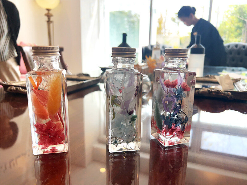 お好きなお花や飾りを瓶に詰め、オリジナルのハーバリウムを作られました。