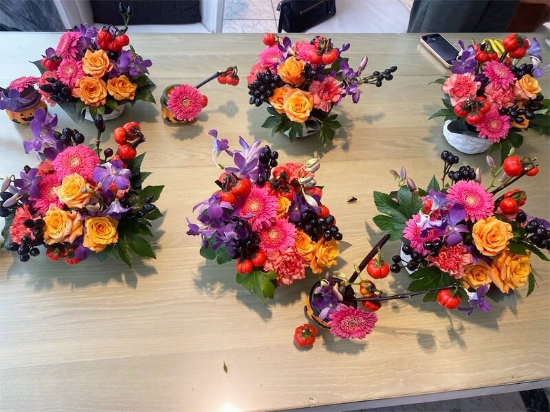 お客様自身がお好きな花を選び、思い思いのハロウィン風花籠を作られました。