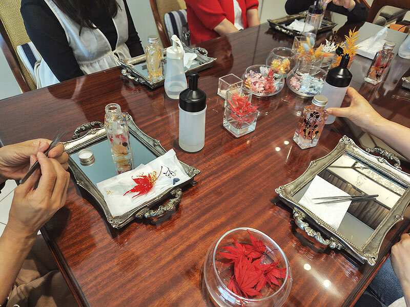 当式場のフローリストが講師となり、お客様が真剣な表情でお花や飾りを選びながらも、楽しそうに瓶に詰めていらっしゃる姿がとても印象的で、和やかな雰囲気の中、それぞれの個性が光る素敵なハーバリウムが完成しました。