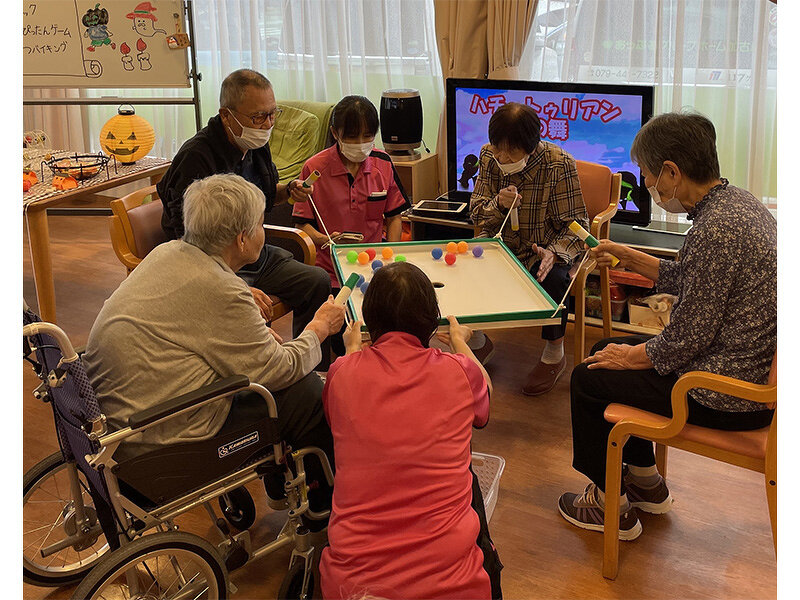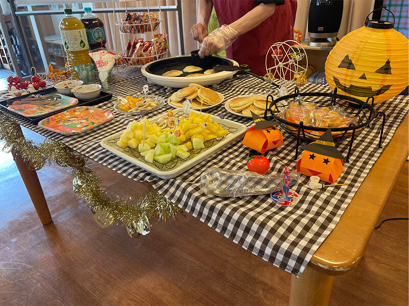 あっぷるデイサービス明石にて「おやつバイキング付き内覧会」を開催致しました。 ケアマネジャーさん、地域の方、ご家族様に来所していただき、あっぷるのデイサービスで取り組んでいるレクリエーション「ドロップボール」「モルック」を楽しんでいただきました。おやつバイキングでは、季節のフルーツやハロウィンのお菓子を召し上がっていただきました。