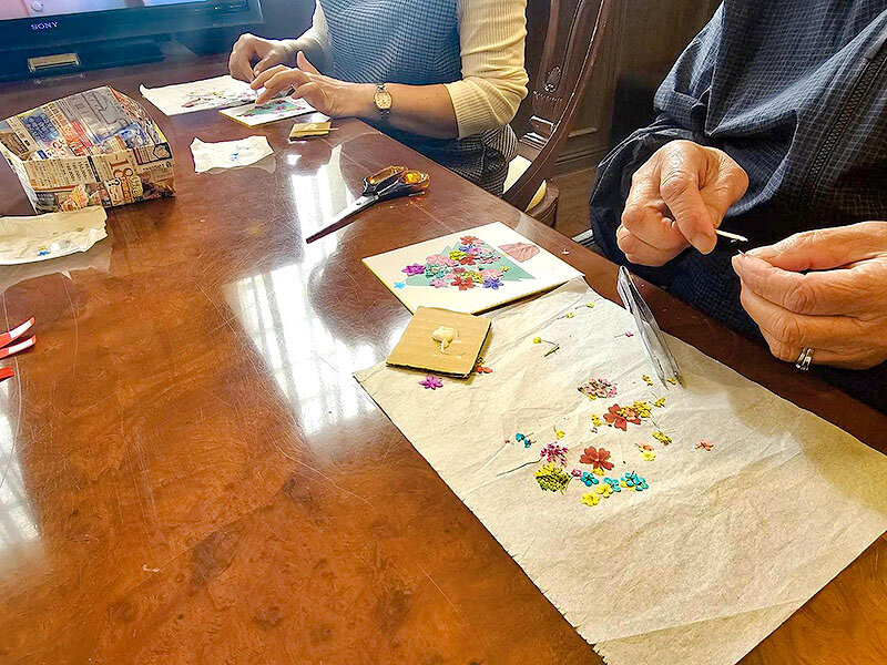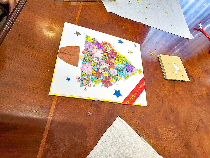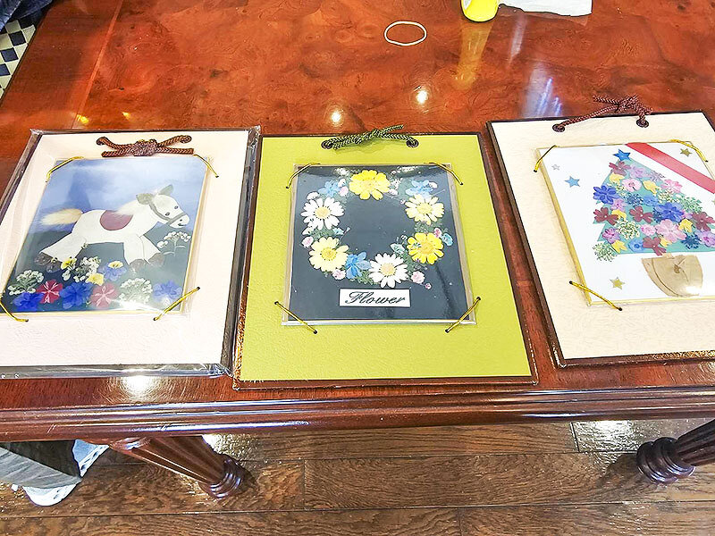 ご参加の皆様には、お手本の飾り付けを見本に、花を丁寧に台紙へ貼り付け、素敵な押し花アート作品が完成しました。