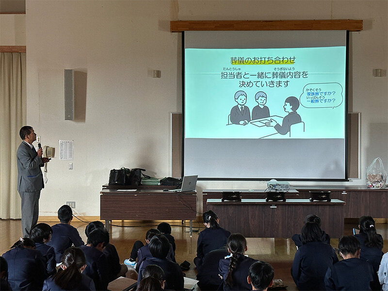6年生を対象に、楽しく学んでもらえるようにスライドを用いて100分間の授業を行い、儀式や年中行事については、イメージしやすいように身近にあることを紹介しながら説明しました。また、結婚式・お葬式・介護の仕事内容を分かりやすく伝えるために、生まれてから亡くなるまでの人生をストーリー仕立てで話をしました。