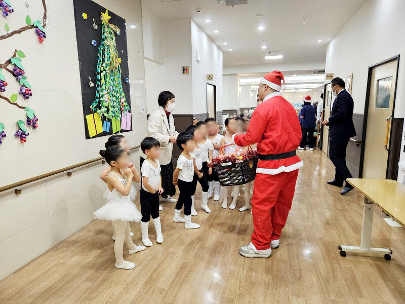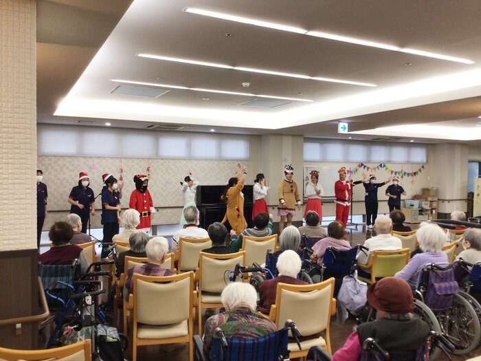 施設内にてクリスマス会を開催しました。 職員によるダンスや、みどりこども園の子供たちによるバレエの披露があり、会場は笑顔と拍手に包まれました。 利用者様は手拍子をされたり、子供たちの踊りを温かい表情で見守られるなど、終始和やかな雰囲気で楽しまれていました。 最後にはサンタクロースに扮した職員が登場し、利用者様お一人おひとりにプレゼントをお渡ししました。 季節を感じる、心温まるひと時となりました。