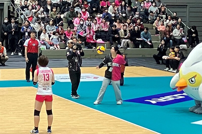 姫路ヴィクトリーナ上原球団社長から山下社長にペナントが手渡され、ファーストサーブは飾磨大和会館の南穂花さんが見事なサーブを決めて試合開始。