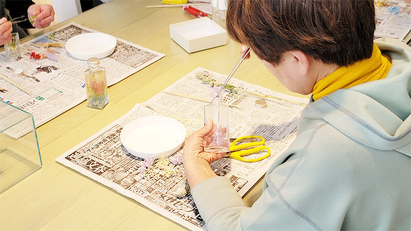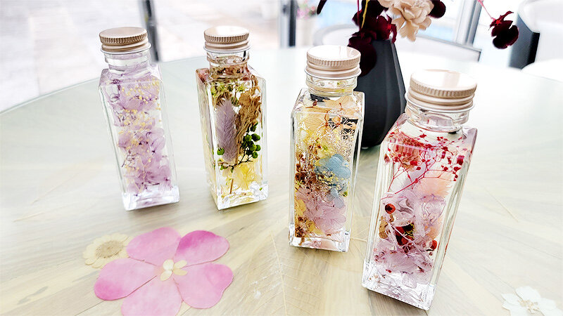 お好きな花を選んでいただき、お客様自身が思い思いのアレンジで、皆様個性あふれる素敵なハーバリウムが完成しました。