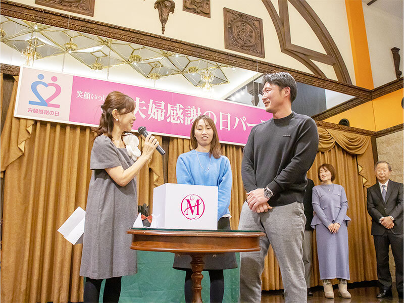パーティ開演後、ルビー婚式を迎えられた3組のご夫妻をはじめ、30年・20周年のご夫妻に、アニバーサリー抽選会にご参加いただきました。