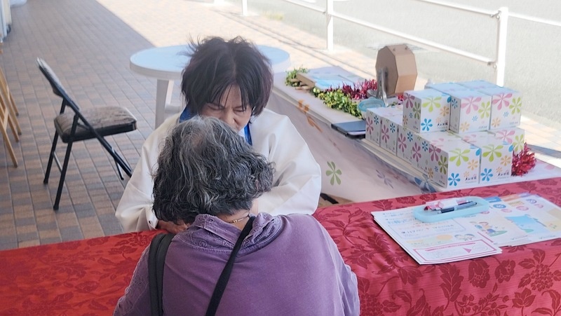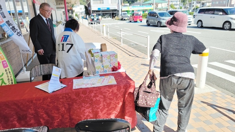 台風の影響で風の少し強い中でしたが、お買い物の帰りのお客様にたくさんお立ち寄りいただき、冠婚葬祭についてのご質問にお答えしたり、新商品の葬儀費用保険についての説明や抽選会をお楽しみいただきました。